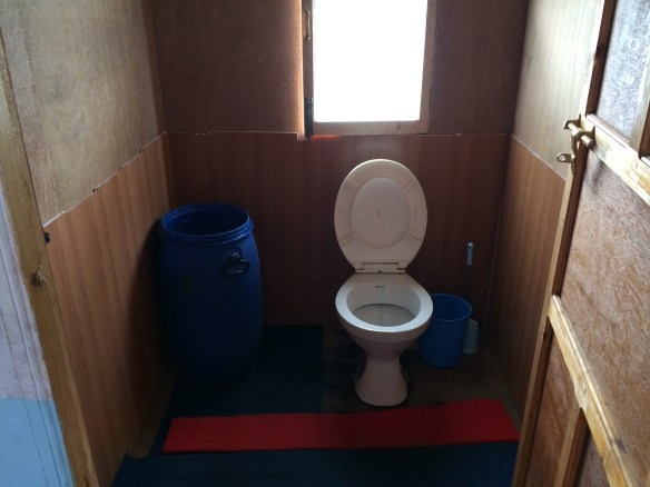 No es necesario acampar o dormir en carpas durante el trekking. Por todo el recorrido existen varias villas con varios lodges o “Tea Houses” que poseen una infraestructura razonable y un mínimo de confort. Todos son muy parecidos, con un gran comedor con un calefactor en el centro, cuyo fuego se alimenta generalmente con estiércol seco de yendo, habitaciones con dos camas individuales o una cama doble y baños bastante simple. Las camas tienen sábanas, almohadas y mantas. Nosotros llevamos una funda de almohada y también una bolsa de dormir no muy caliente (temperatura de confort de 10ºC). Muchos llevan bolsas de dormir para temperaturas de hasta -20ºC, pero eso definitivamente no es necesario. Dormir bien, la bolsa de dormir fue hasta dispensable en algunas noches, pues las mantas disponibles eran muy gruesas y suficientes para mantenerse calientes. Es claro que si quieres dormir desnudo, ahí es otra historia. La mayoría de los baños que encontramos tenían vasos sanitarios, pero algunos tenían sólo una letrina y un tambor con agua para jugar después de utilizarlos. En las aldeas más altas, los baños no tenían fregadero ni grifo, lo que nos obligaba a lavar la cara y cepillarse los dientes con una botella de agua. Es difícil lavarse las manos con el agua helada, por lo tanto, un baño frío está fuera de consideración. Prepárese para quedarse al menos unos 10 días sin bañarse. Un paquete de pañuelos humedecidos es la salida. Si golpea la desesperación, algunos lodges ofrecen “caliente caliente” por $ 4,00 o $ 5,00 pero es una operación bastante compleja tomar un baño de balde y caniquita cuando la temperatura está muy cerca de cero grado. No se asuste, los baños no son tan mal como pueden parecer.