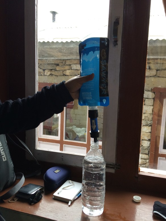 Usted necesita ingerir por lo menos 3 litros de agua al día para minimizar los efectos de la altitud. No cometa el error de no hidratarse pues podrá comprometer todo su trekking. Un litro de agua vendido a lo largo de la pista suele costar alrededor de US $ 1,00 en las localidades más bajas, pudiendo llegar a los US $ 4,00 en las villas más altas. Optamos por llevar un filtro llamado Sawyer Mini. Él es muy pequeño y viene acompañado de un squeeze que utilizamos para llenar nuestros camelbaks todos los días cuando llegábamos a los lodges, dejando todo listo para el día siguiente. En este sitio usted encuentra un análisis completo de todos los filtros disponibles: https://sectionhiker.com/sectionhiker-gear-guide/10-best-backpacking-water-filters-2018. Si no puede adquirir ninguno de ellos, tendrá que comprar agua en los lodges en el transcurso de la pista o utilizar pastillas de purificación como el Clor-in.