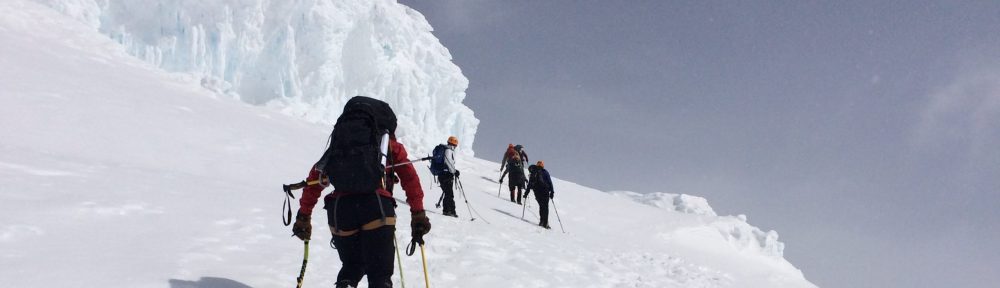 Depois de 7h de caminhada chegamos ao topo. A visibilidade estava bem limitada por causa de um “whiteout” que nos acompanhou quase o tempo todo. Ficamos por volta de uns 40 minutos no cume descansando, comendo lanches e tirando fotos. Metade do caminho percorrido, era hora de começar a descida. O cansaço já era grande e a neve, por causa do horário e do tempo mais quente, ficou muito fofa no caminho de volta. Por vezes, a cada passo dado a perna afundava na neve até os joelhos.
